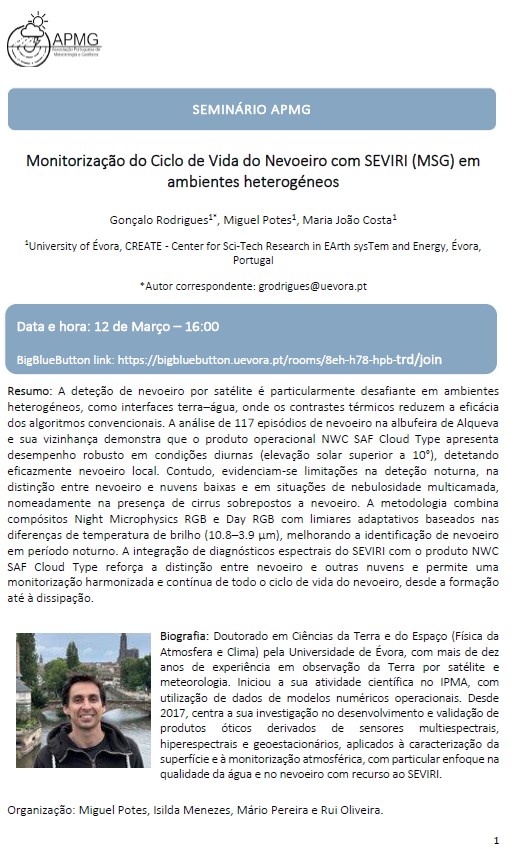 Jueves 12 de marzo a las 16 horas de Portugal (17 en España), seminario de la APMG sobre “Monitorización del ciclo de vida de la niebla con SEVIRI (GMS) en entornos heterogéneos”