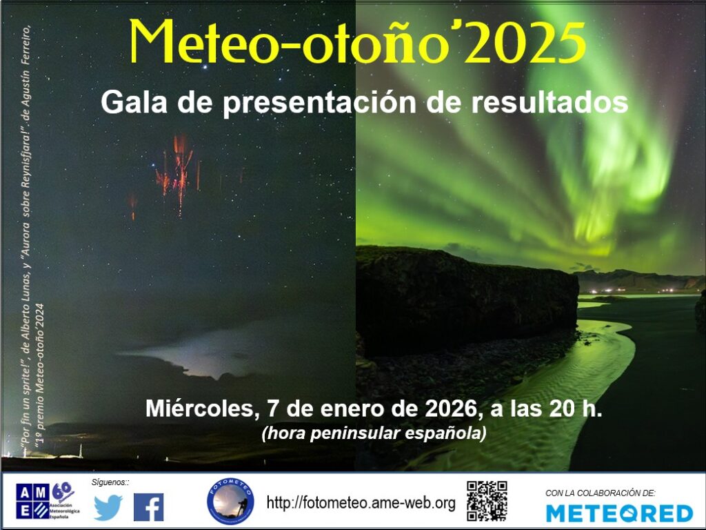El miércoles, 7 de enero de 2026, a las 20 h. peninsulares, se presentarán en directo los resultados del concurso fotográfico Meteo-otoño’2025, en la “gala” que tendrá lugar a través de Teams, con este enlace para asistir en directo