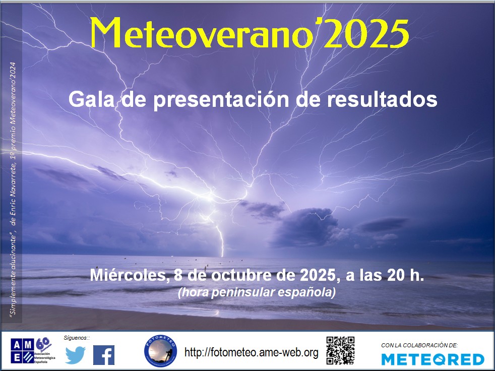 El miércoles, 8 de octubre de 2025, a las 20 h. peninsulares, se presentarán en directo los resultados del concurso fotográfico Meteoverano’2025 en la “gala” que tendrá lugar a través de Teams, con este enlace para asistir en directo