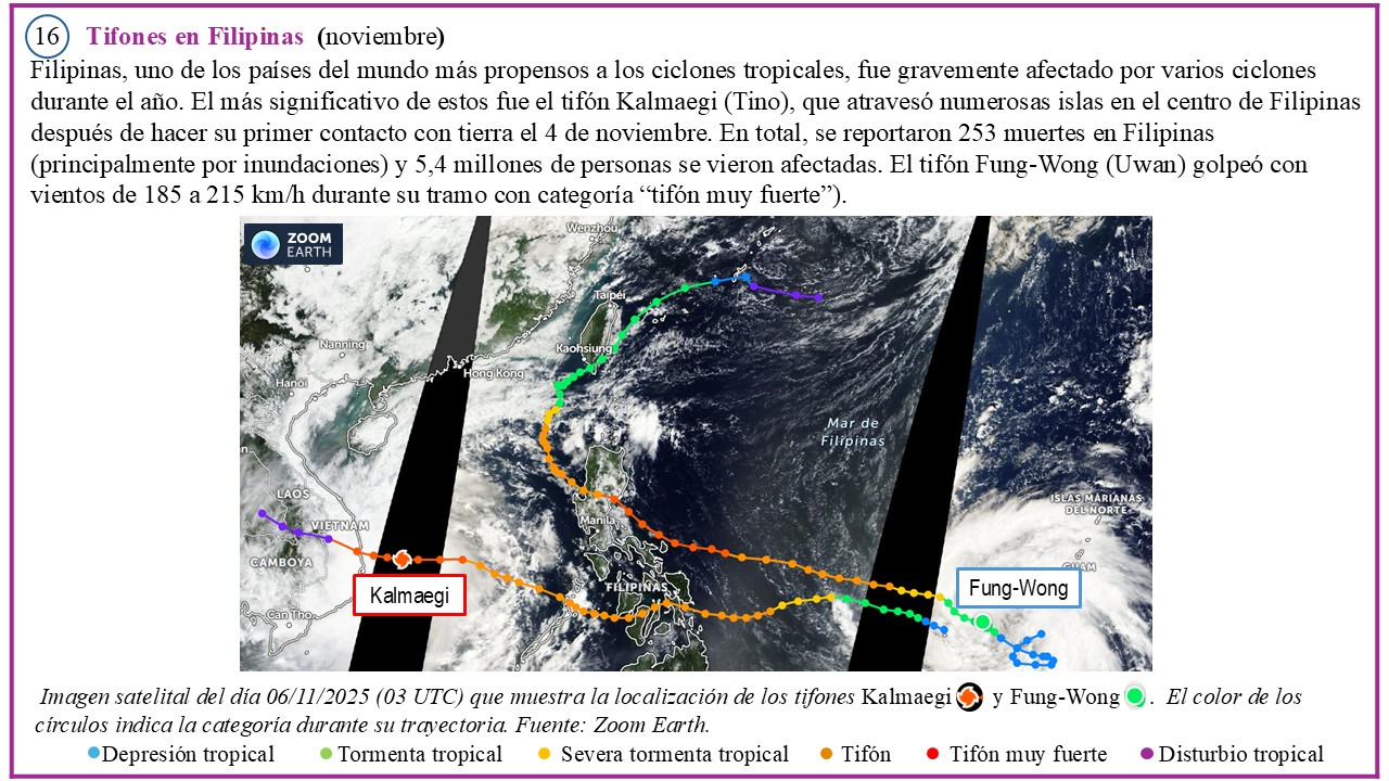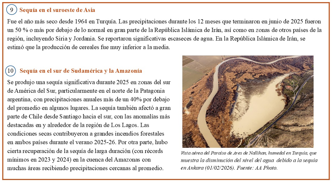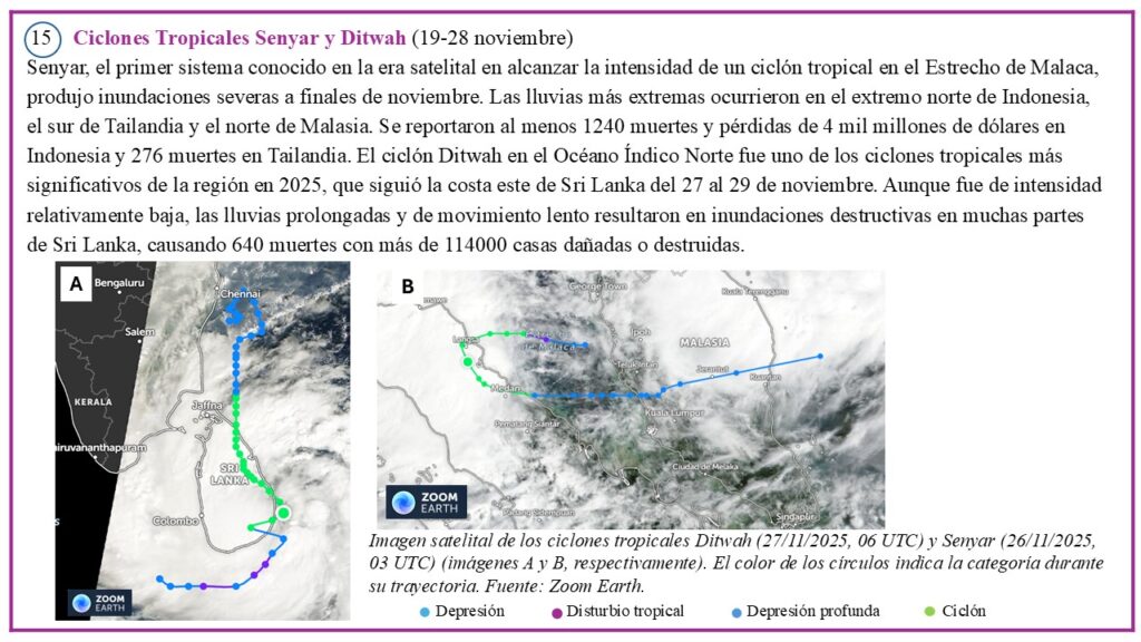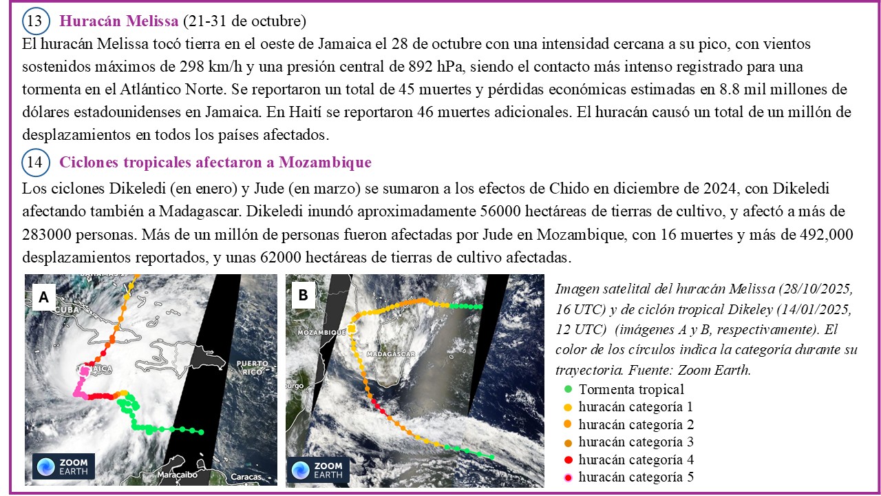 El mapa de la Figura 1 muestra la localización de eventos meteorológicos y climáticos de alto impacto, seleccionados en el informe anual 2025 de la Organización Meteorológica Mundial (OMM) sobre el estado del clima.  Esta serie de eventos extremos se complementan con otros tantos mencionados en el suplemento “Significant Weather & Climate Events (2025)”, cuyo contenido se basa en información aportada por los Miembros de la OMM, la Organización Internacional para las Migraciones (OIM), el Centro de Monitoreo de Desplazamientos Internos (IDMC), la oficina del Alto Comisionado de las Naciones Unidas para los Refugiados (ACNUR), el Programa Mundial de Alimentos (PMA) y la Organización de las Naciones Unidas para la Alimentación y la Agricultura (FAO).