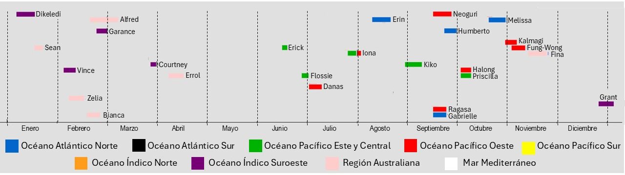 Figura 2: Esquema de la secuencia temporal de los 26 ciclones tropicales en 2025, identificados por la NASA con una categoría igual o superior al nivel 3 en la escala Saffir–Simpson. Imagen adaptada por la AME basada en el gráfico resumen en Wikipedia.org.